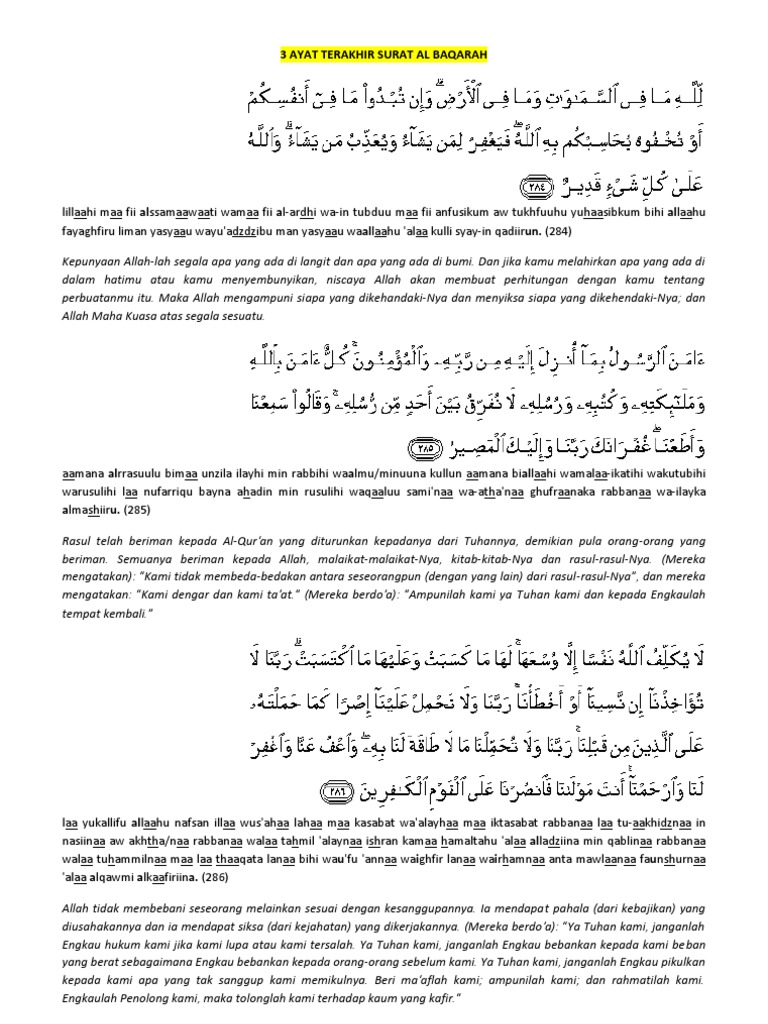 Keutamaan surat al baqarah ayat 285 286 2 ayat terakhir agar di cukupkan urusan dunia akhirat. Pemberitahuan yang menyatakan bahwa dialah tuhan yang maha esa bagi semua makhluk. List download lagu mp3 lagu dua ayat terakhir surah al baqarah gratis streaming lagu terbaru. Dari abu mas'ud ra berkata : Daripada abu mas'ud ra bahawa nabi saw bersabda: